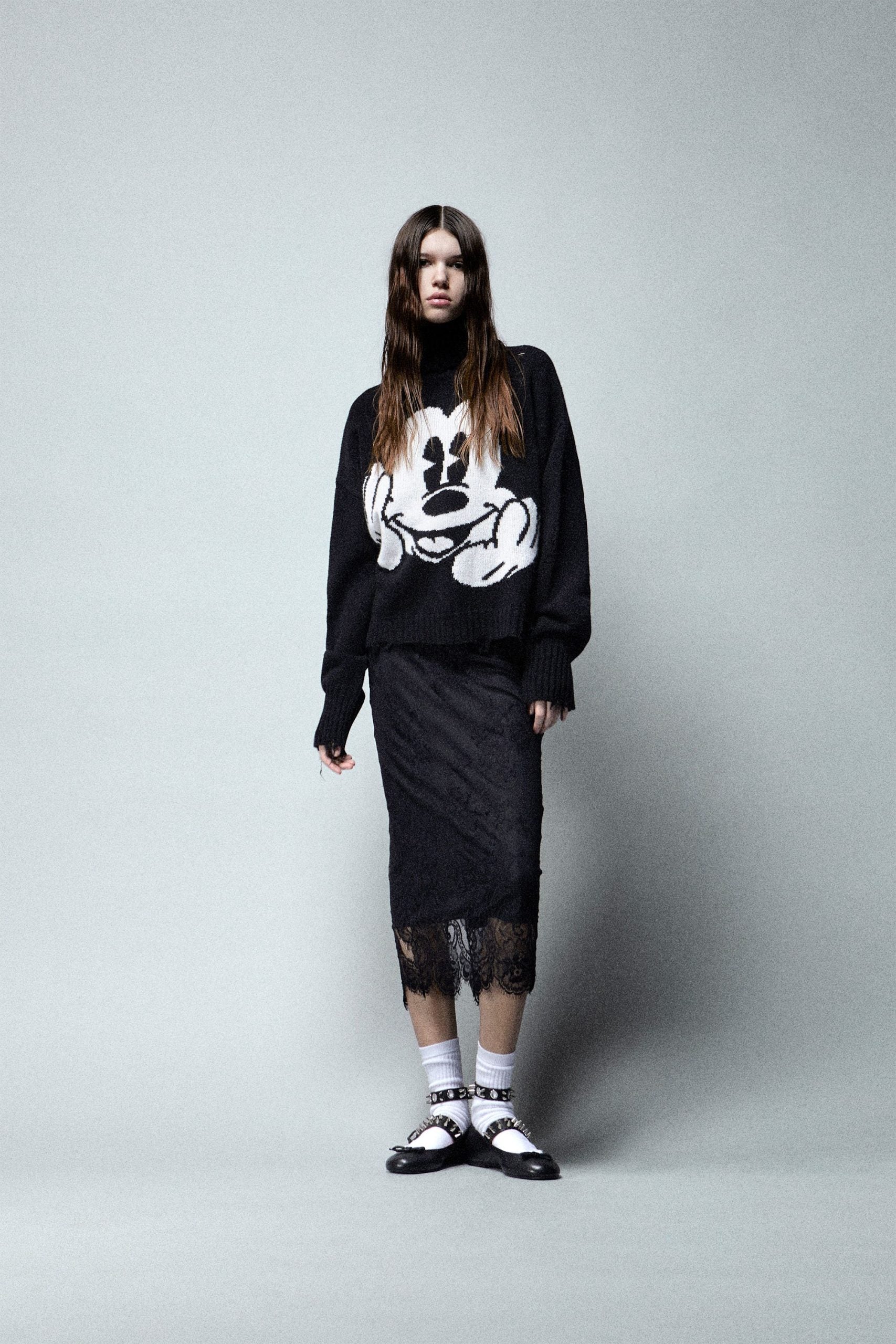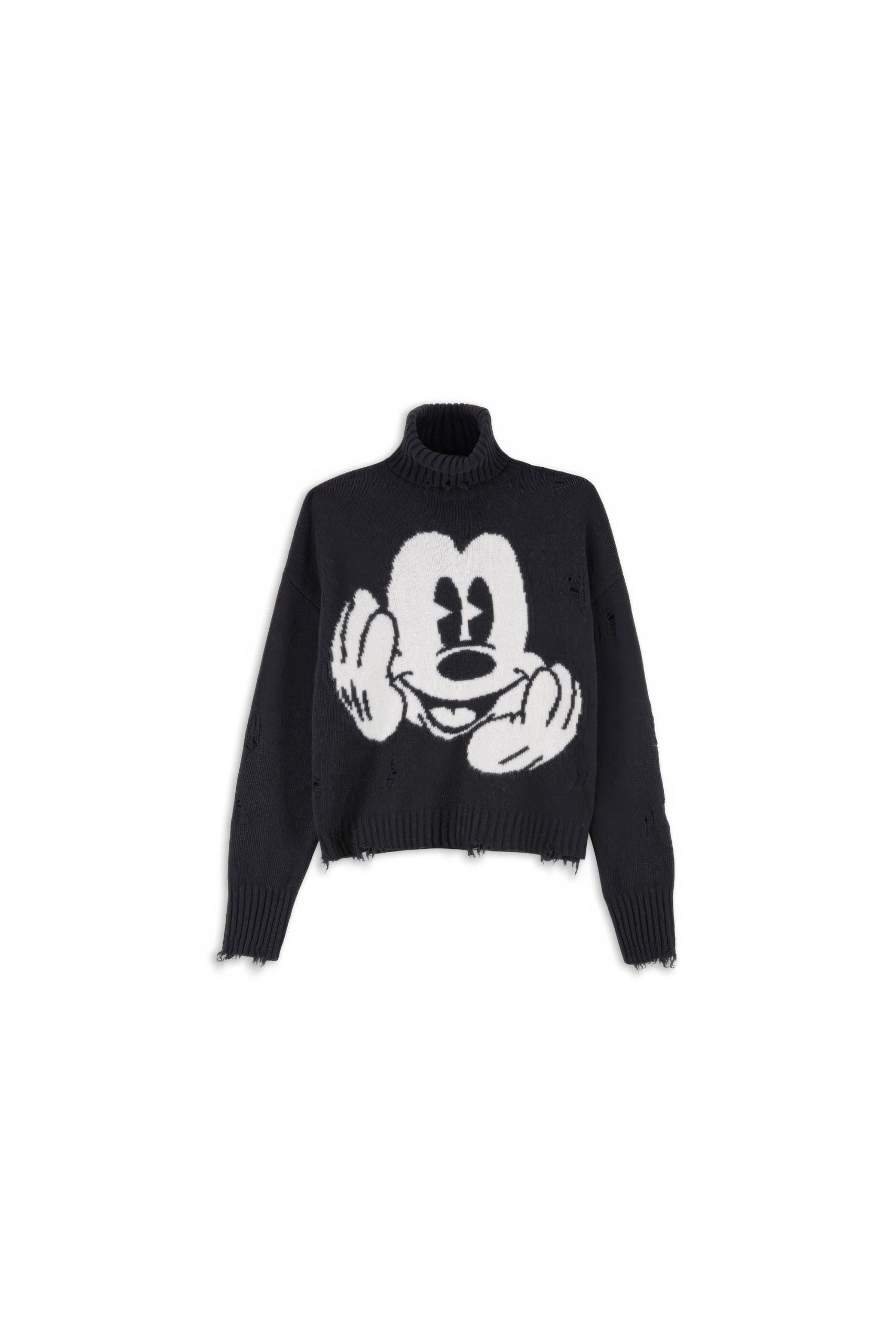 Pull in misto lana con maniche ampie e volume morbido. Maglia con disegno ad intarsio Mickey a colori e con fili fluttuanti.